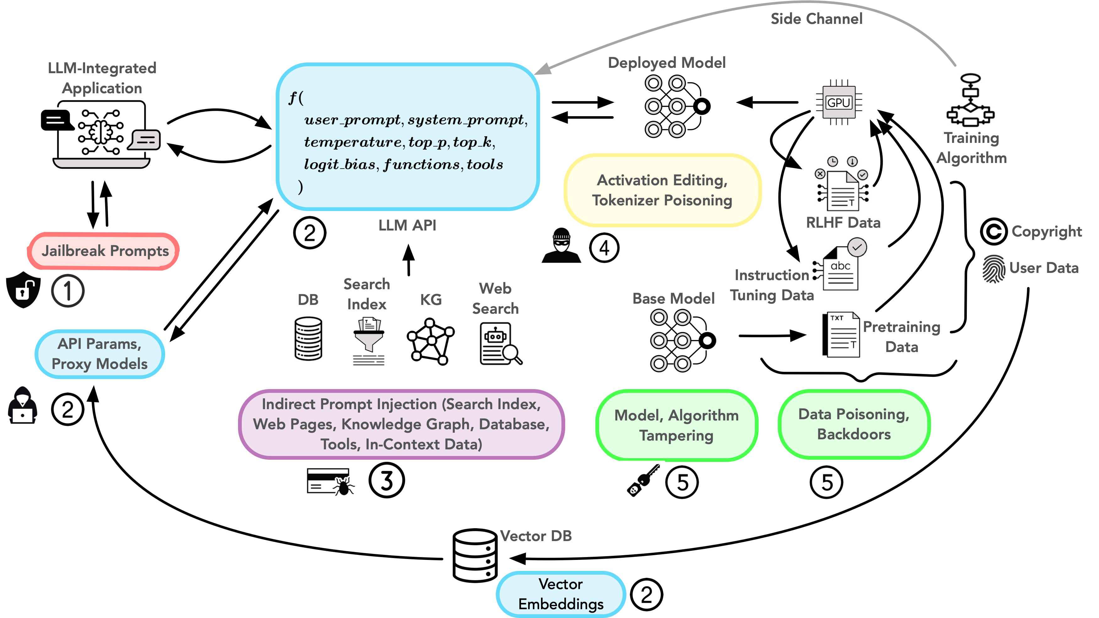 The attack surface is large — prompts, context, training data, inference pipeline, model weights