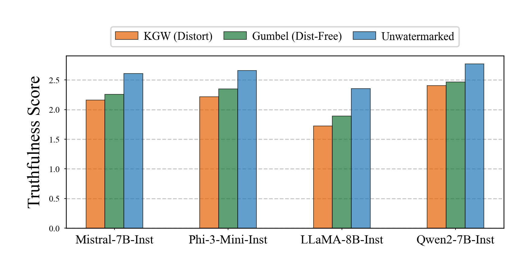 Watermarking reduces truthfulness; KGW (orange) causes larger drops than Gumbel (green).